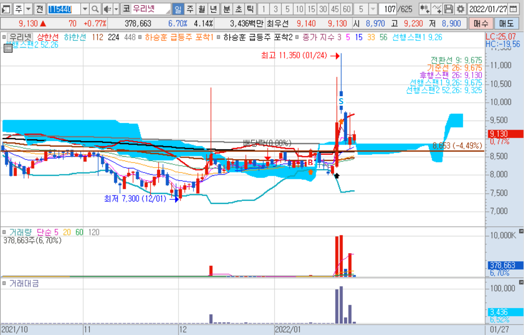 우리넷의 경우 13일이 종가베팅을 할 수 있는 자리라고 생각돼서 매수를 했습니다. 종가베팅을 들어갔던 근거는 아래 두 가지였습니다.