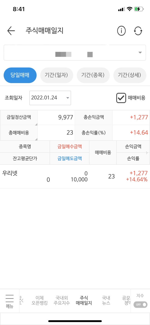 1월 24일 매매 내역입니다. 1월 13일에 매수하였던 우리넷을 수익 실현하였습니다.