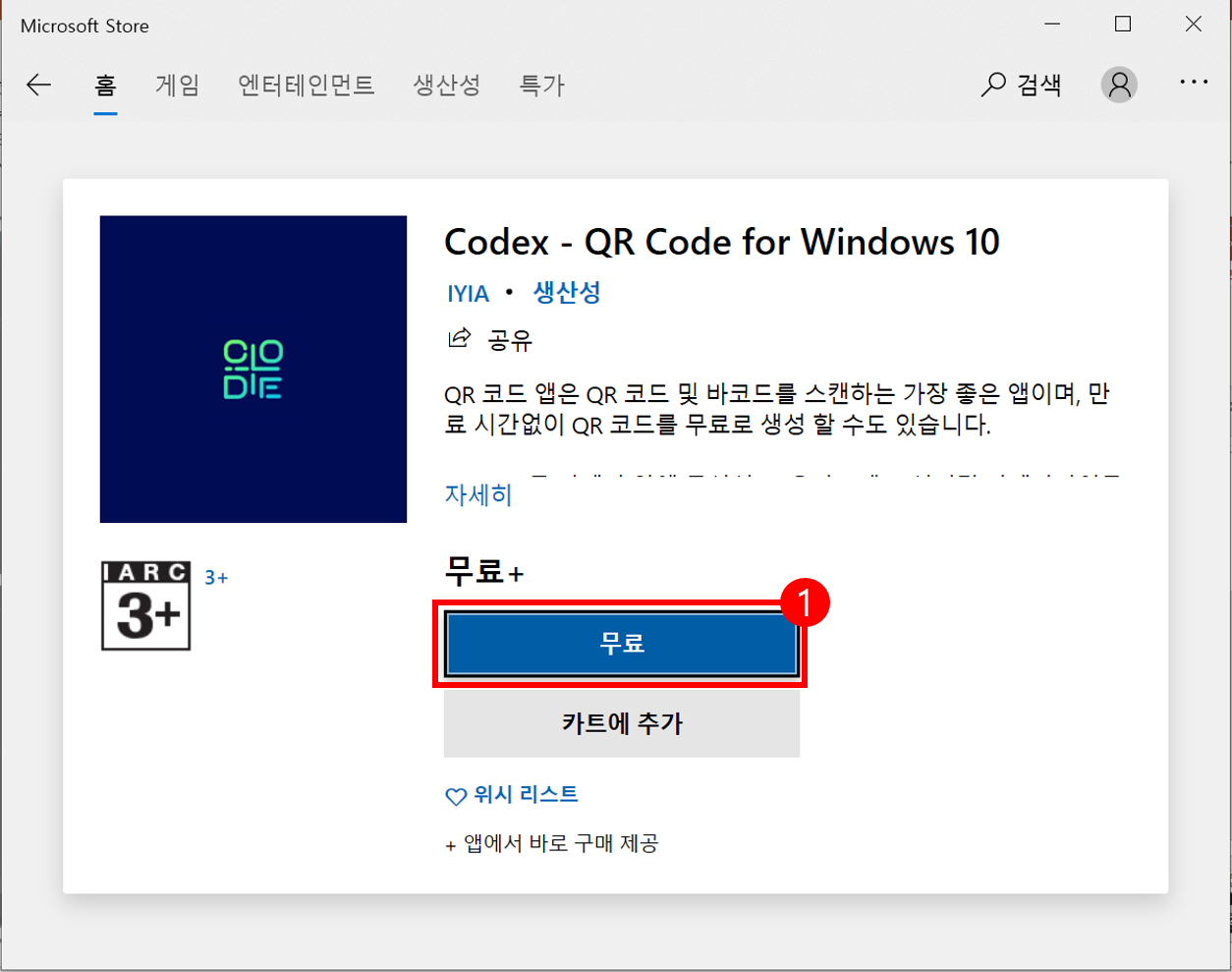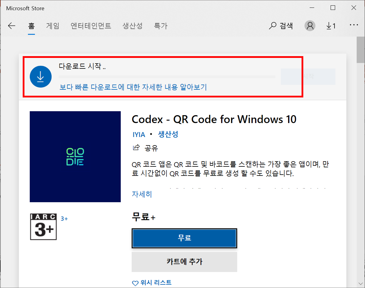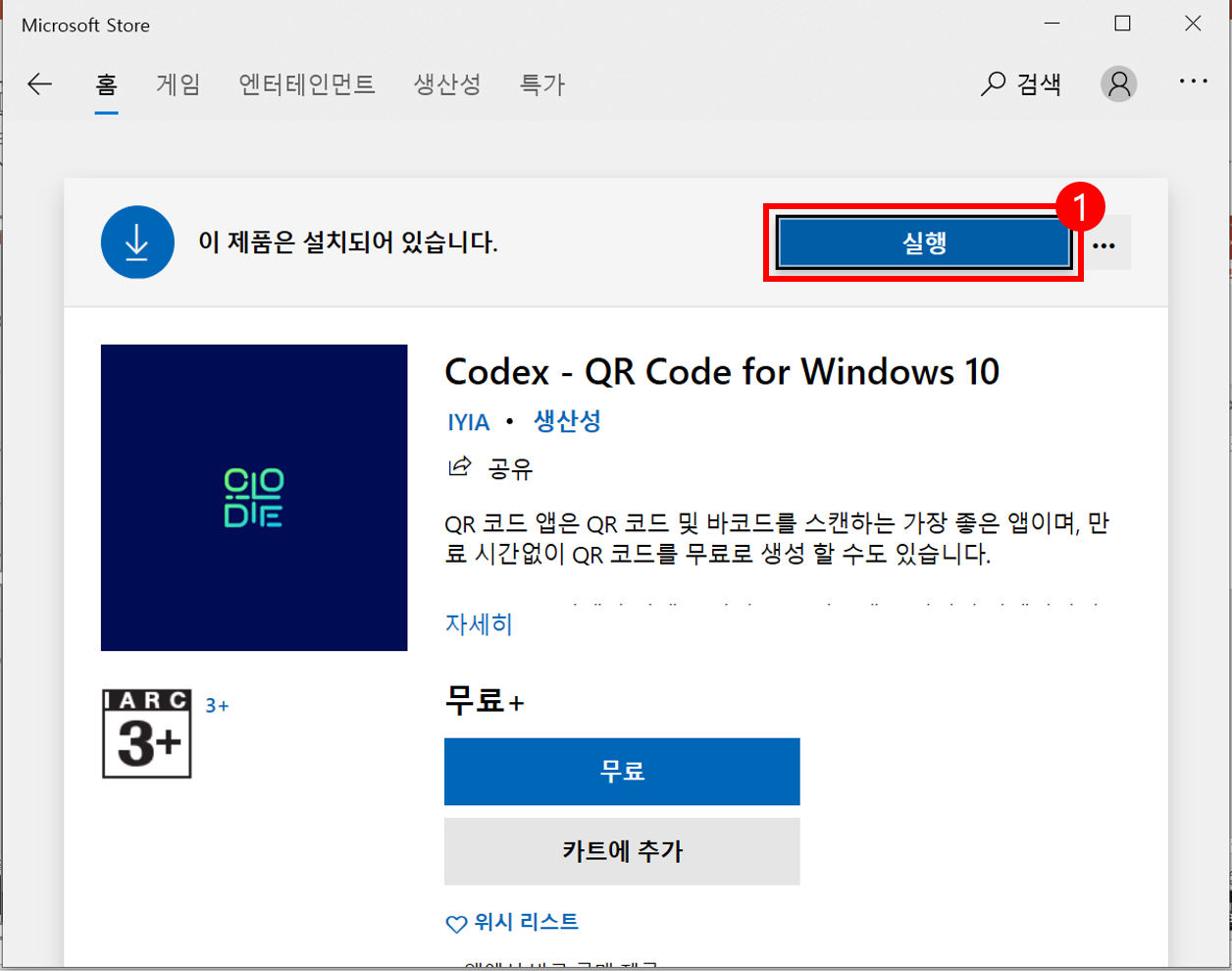검색 창에서 다운로드할 앱을 클릭하면 다운을 받을 수 있는 창으로 넘어옵니다. [무료]를 클릭하면 잠시 동안 다운로드가 진행되며 설치가 완료되면 [실행] 버튼을 클릭해서 바로 애플리케이션을 실행하겠습니다.