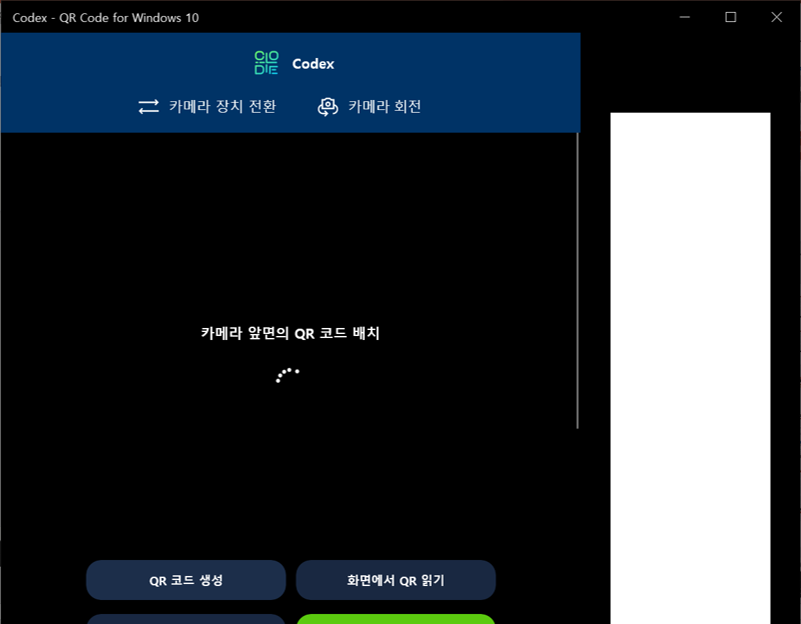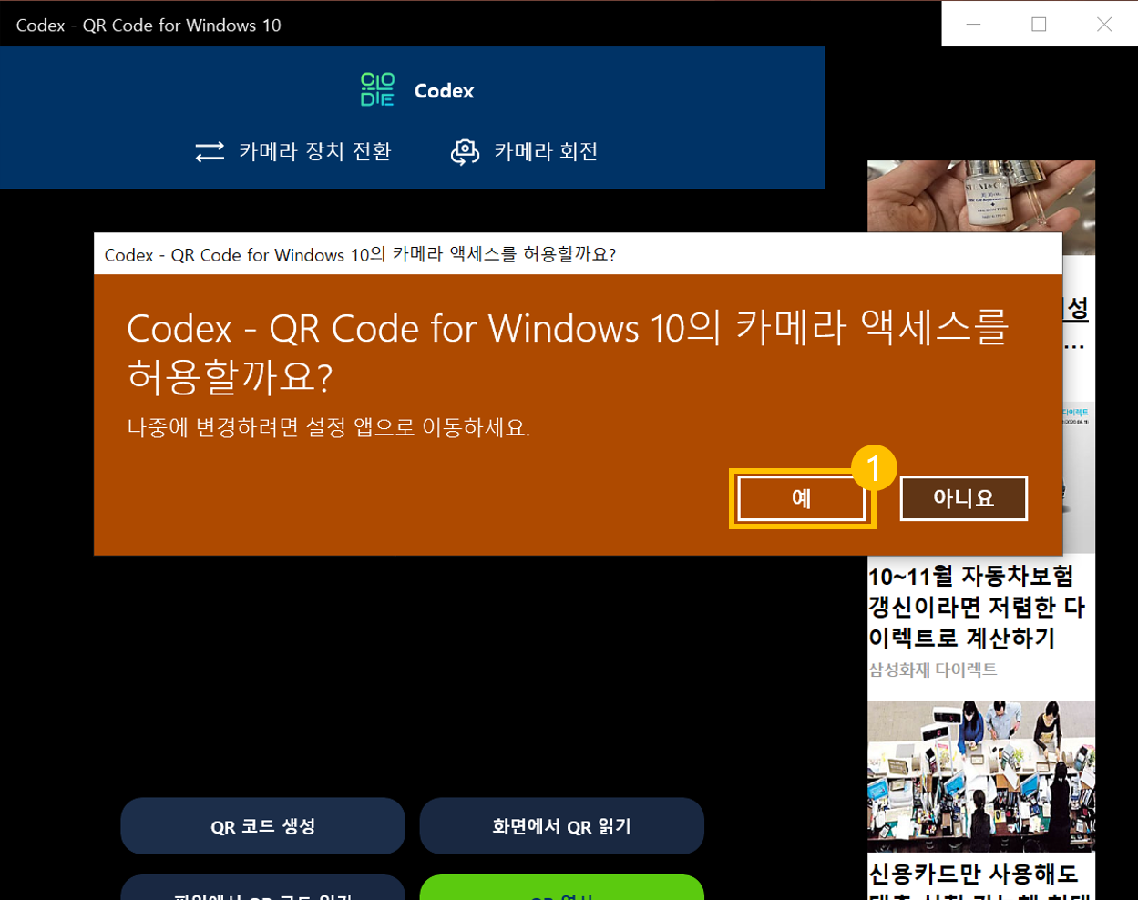 설치한 프로그램이 실행되는 과정입니다. 실행 후 잠시 기다리면 카메라 액세스 허용 문구가 나오게 됩니다. QR코드 스캔을 위해서는 카메라를 사용해야 하기 때문에 "예" 버튼을 클릭하겠습니다. 클릭 후 잠시 기다리면 스캔을 할 수 있도록 카메라가 활성화됩니다.