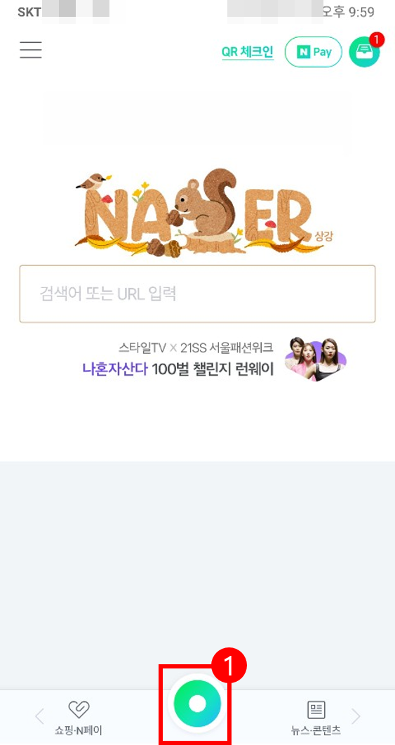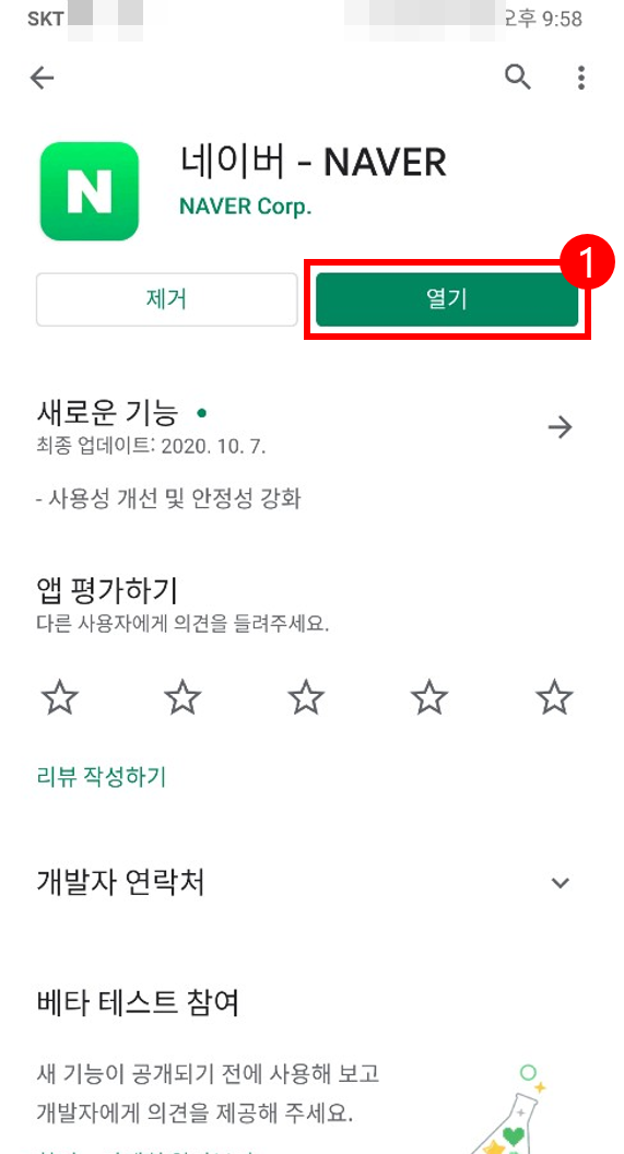 두 번째로 안드로이드 폰에서 QR코드를 스캔하기 위한 두 가지 방법을 소개하겠습니다. 첫 번째 방법은 네이버 애플리케이션을 이용하는 방법입니다. 플레이스토어에서 네이버 어플을 다운로드 한 뒤 실행을 하겠습니다.