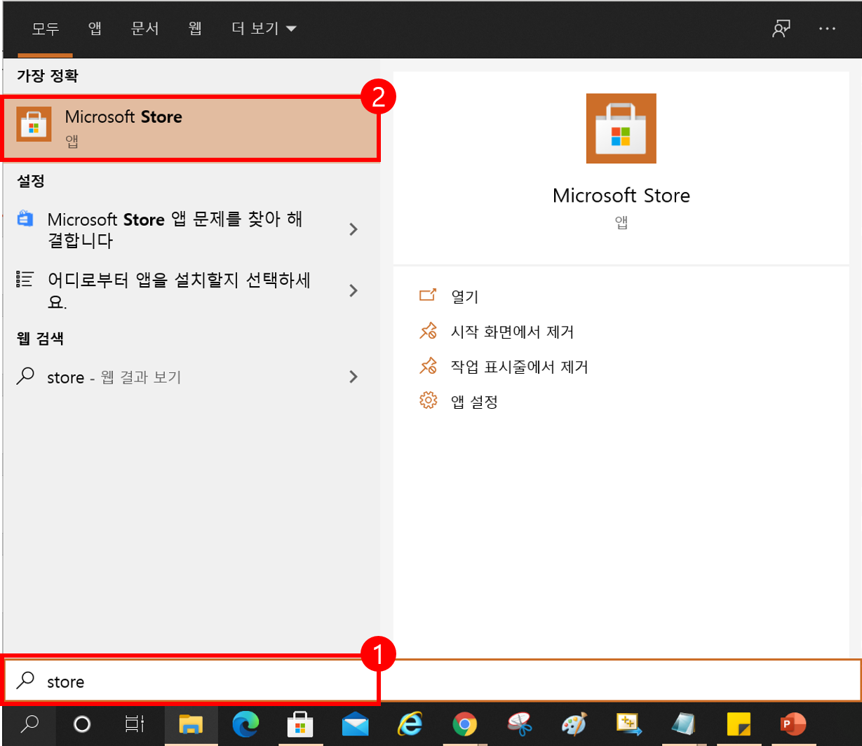 첫 번째 과정은 QR코드 스캔을 위한 애플리케이션을 다운로드해주어야 합니다. 작업 표시줄의 검색 버튼을 클릭해서 store라고 검색한 뒤 "Microsoft Store"에 들어갑니다. Store 상단의 검색 창에 "qr code"라고 검색을 하면 여러 개의 qr코드 스캐너가 있습니다. 그중 "Codex - QR Code for Windows 10"을 다운로드하겠습니다.