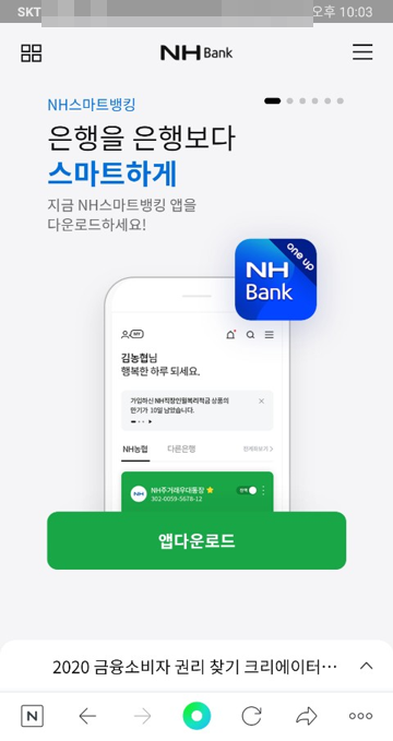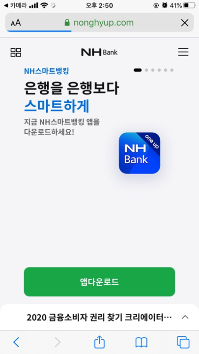 저 같은 경우 NH스마트뱅킹 다운로드를 할 수 있는 웹 사이트 정보가 담긴 QR코드를 스캔해보았습니다. 스캔 후 링크를 클릭하면 농협은행 웹 사이트로 잘 이동하는 것을 볼 수 있습니다. 만약 QR코드와 스마트 폰의 거리가 너무 멀 경우 "좀 더 가까이 이동하십시오"라는 문구가 나오며, 제대로 인식이 되지 않을 경우 화면의 초점을 다시 한번 맞춰서 시도해보시기 바랍니다.