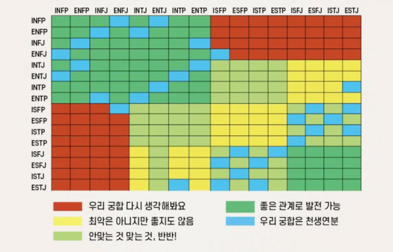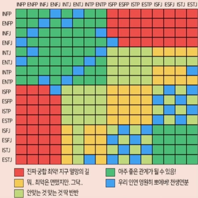 mbti 별로 궁합을 나타낸 표도 있습니다. 이도저도 아닌 유형, 잘맞는 유형, 완전 상극인 유형 등에 대해서 나타낸 것인데요. 재미로 한 번 봐보시기 바랍니다.